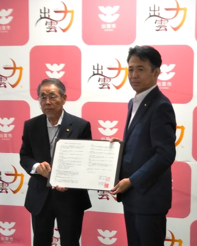 締結式は7月4日に出雲市役所で行われ、飯塚出雲市長と野津会長により協定書が取り交わされました。
