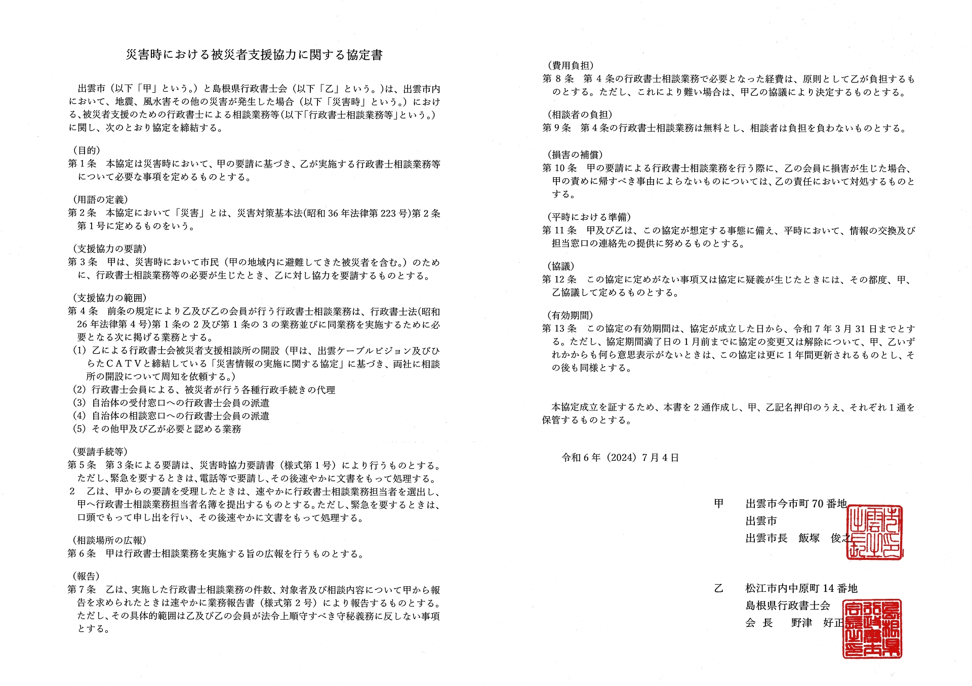 この協定は、災害時における被災者の一刻も早い生活再建を実現するため、出雲市と本会が連携し、相談所の設置、被災者が行う罹災証明の作成や補助金の申請などの代行、出雲市受付窓口への行政書士会員の派遣などを円滑に実施するためのものです。